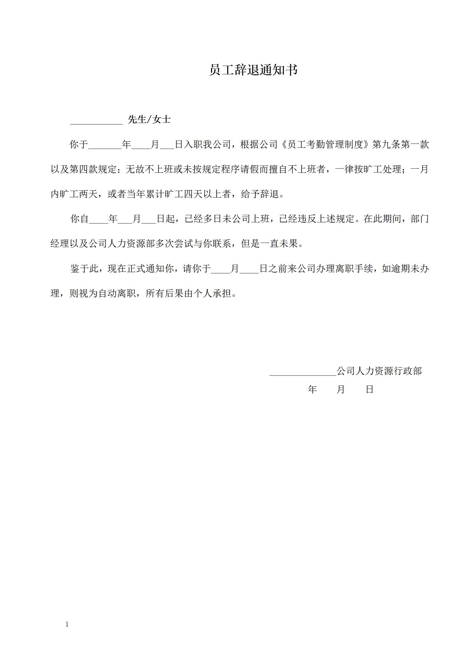 你于_______年____月___日入职我公司,根据公司《员工考勤管理制度》第九条第一款以及第四款规定:无故不上班或未按规定程序请假而擅自不上班者
